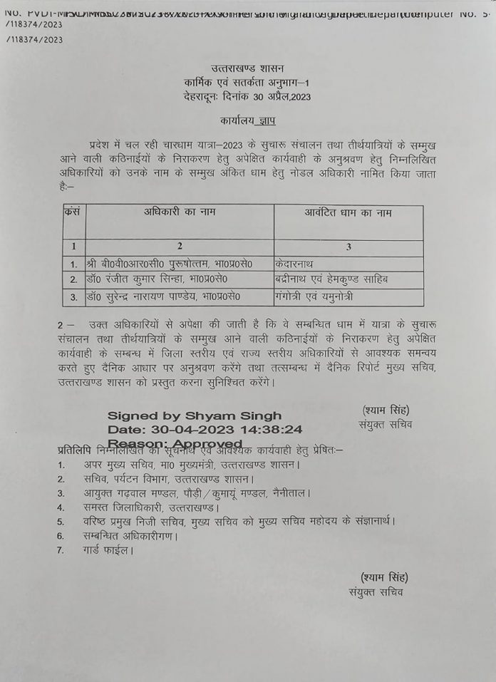 देहरादून – चार धाम यात्रा की कुशल संचालन में आ रही दिक्कतों कठिनाइयों को दूर करने के लिए शासन ने तीन वरिष्ठ आईएएस अफसरों को किया तैनात।