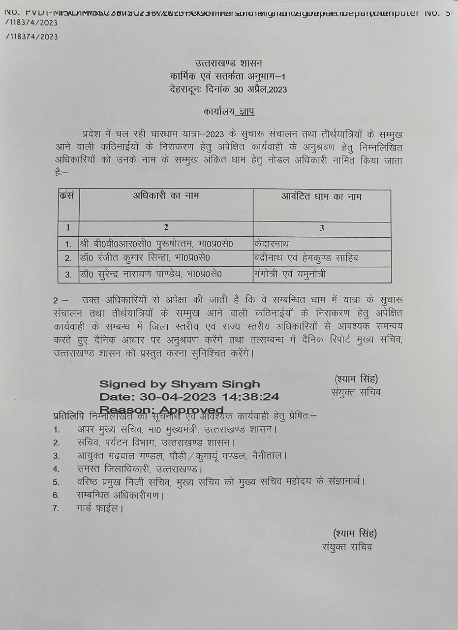 बीवीआरसी पुरुषोत्तम को केदारनाथ धाम का जिम्मा। रंजीत सिन्हा देखेंगे बद्रीनाथ व हेमकुंड साहिब। सूर्य नारायण पांडे देखेंगे गंगोत्री व यमुनोत्री धाम।