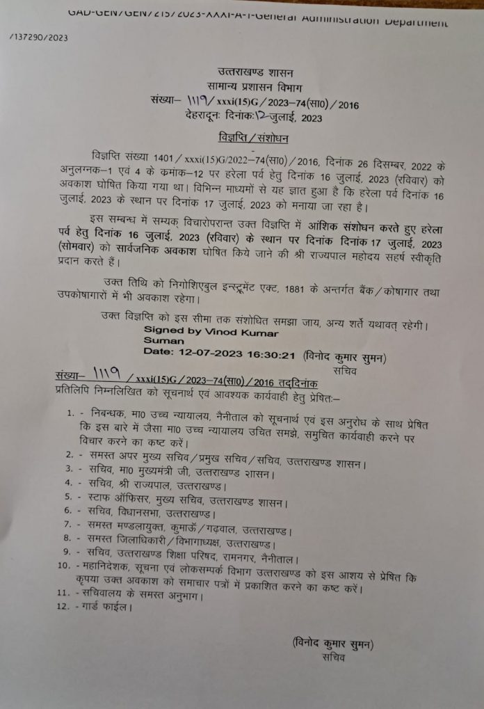 इस सम्बन्ध सम्यक् विचारोपरान्त उक्त विज्ञप्ति में आंशिक संशोधन करते हुए हरेला पर्व हेतु दिनांक 16 जुलाई 2023 (रविवार) के स्थान पर दिनांक दिनांक 17 जुलाई, 2023 (सोमवार) को सार्वजनिक अवकाश घोषित किये जाने की राज्यपाल महोदय सहर्ष स्वीकृति प्रदान करते हैं।
