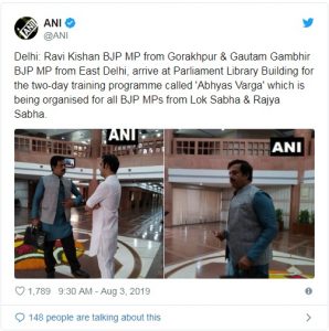 भाजपा ने संसद में लोकसभा और राज्यसभा के सांसदों के लिए ‘अभ्यास वर्ग’ नाम का प्रशिक्षण कार्यक्रम आयोजित किया है। ये कार्यक्रम दो दिनों तक चलेगा। इसमें शामिल होने के लिए प्रधानमंत्री नरेंद्र मोदी, सांसद साध्वी प्रज्ञा सिंह ठाकुर, अनुराग ठाकुर, गिरिराज सिंह समेत कई नेता संसद पहुंच गए हैं। इनके अलावा गोरखपुर से सांसद रवि किशन और पूर्वी दिल्ली से सांसद गौतम गंभीर भी कार्यक्रम में शामिल होने के लिए संसद की लाइब्रेरी बिल्डिंग में पहुंचे हैं। इस कार्यक्रम में सांसदों को पार्टी की विचारधारा से लेकर संगठन के गुर सिखाए जाएंगे। भाजपा के इस बार 125 सांसद ऐसे हैं, जो पहली बार जीतकर संसद भवन पहुंचे हैं। कार्यक्रम में शामिल होने के लिए गृह मंत्री अमित शाह, वित्त मंत्री निर्मला सीतारमण और भाजपा कार्यकारी अध्यक्ष जेपी नड्डा भी संसद पहुंच गए हैं।