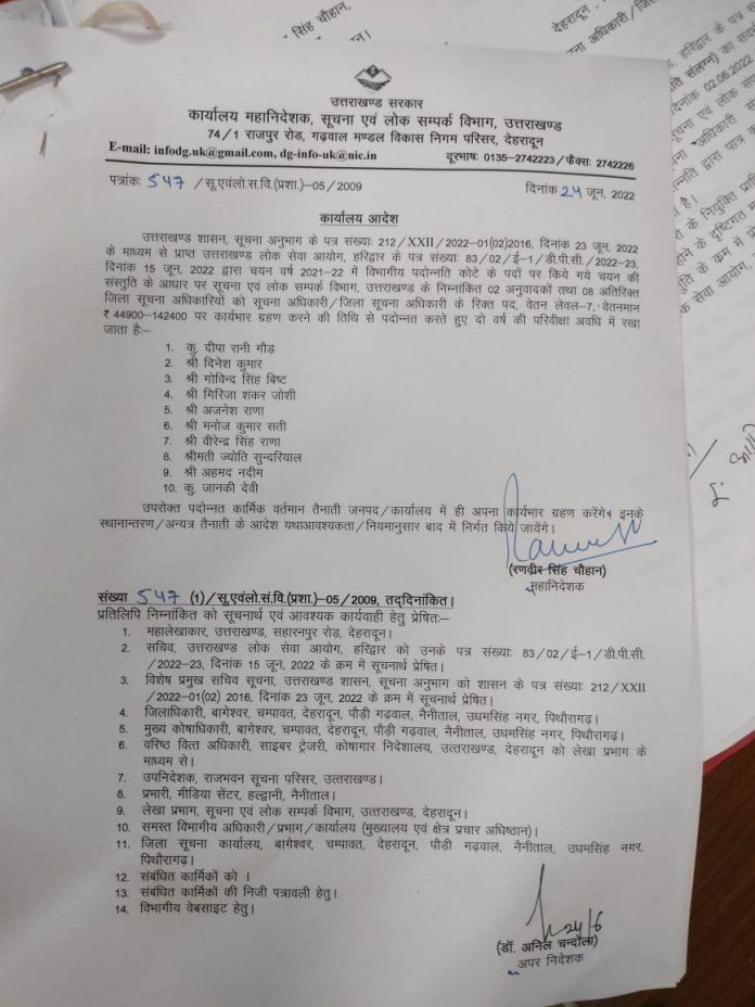 देहरादून – महानिदेशक सूचना रणवीर सिंह चौहान द्वारा जारी आदेश के क्रम में सूचना एवं लोक सम्पर्क विभाग के 02 अनुवादकों एवं 08 अतिरिक्त जिला सूचना अधिकारियों को सूचना अधिकारी/जिला सूचना अधिकारी के पद पर पदोन्नत किया गया है।