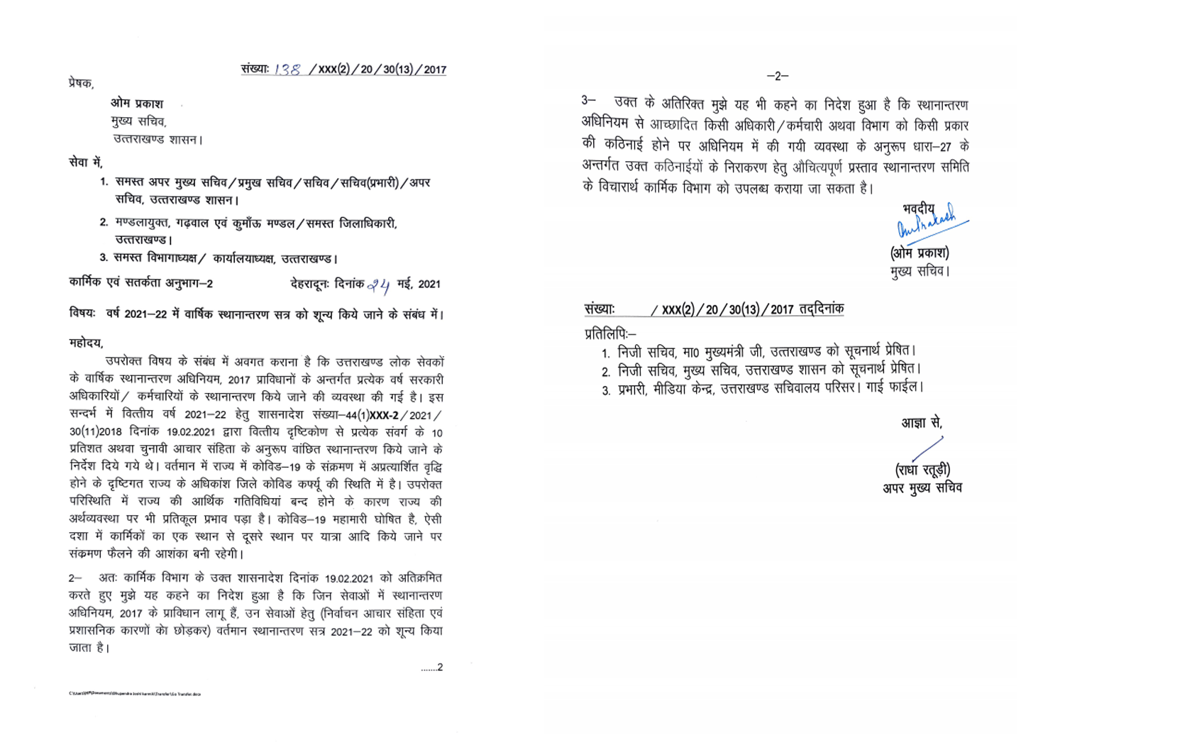 देहरादून- मुख्यमंत्री तीरथ सिंह रावत के 19 अप्रैल को लगाए गए प्रदेश में ट्रांसफर पर रोक व तबादला सत्र शून्य के बाद एक और नया आदेश मुख्य सचिव ने जारी कर दिया है।मुख्य सचिव ने कोविड काल व कर्फ़्यू को देखते हुए मौजूदा तबादला सत्र में कोई भी तबादला न करने की संस्तुति राज्य के समस्त अफसरो व गढ़वाल कुमाऊँ के कमिश्नरों से की है।हलांकि सीएम के आदेशों के बावजूद 5 अलग अलग तबादला सूची जारी हो चुकी है।