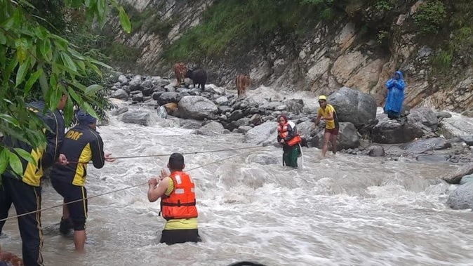एसडीआरएफ की टीम मौके पर पहुंची। घटनास्थल पर पहुंचकर ज्ञात हुआ कि उक्त स्थानीय महिलाएं अपने पशु लेने नदी पार गई थी। अचानक नदी का जलस्तर बढ़ने से वह बीच नदी में फंस गई। एसडीएआरएफ रेस्क्यू टीम के द्वारा दोनों महिलाओं को लाइफ जैकेट पहनाकर रोप रिवर क्रासिंग की सहायता से नदी के इस पार लाया गया। इसके बाद फंसी हुई तीन गायों को भी एक-एक कर के सुरक्षित नदी के इस पार लाया गया। एक महिला के घुटने में चोट भी लग गई थी। एसडीआरएफ टीम द्वारा उक्त महिला को प्राथमिक उपचार देकर परिजनों के साथ घर भेजा गया।