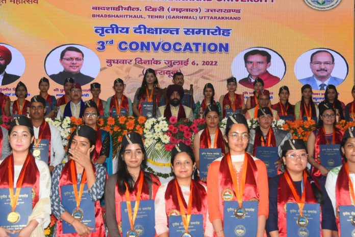 देहरादून – राज्यपाल लेफ्टिनेंट जनरल गुरमीत सिंह (से नि) ने बुधवार को पेस्टल वीड कॉलेज में आयोजित श्री देव सुमन उत्तराखण्ड विश्वविद्यालय, बादशाहीथौल, टिहरी गढ़वाल के तृतीय दीक्षांत समारोह में बतौर मुख्य अतिथि प्रतिभाग किया। दीक्षांत समारोह में विशिष्ट अतिथि उच्च शिक्षा मंत्री डा. धन सिंह रावत भी उपस्थित रहे। इस समारोह में वर्ष 2019, 2020 एवं 2021 में उर्त्तीण हुए 41,423 छात्र-छात्राओं को राज्यपाल एवं उच्च शिक्षा मंत्री ने उपाधियां प्रदान की। स्नातक एवं परास्नातक कक्षाओं में उच्चतम अंक प्राप्त करने वाले 180 छात्र-छात्राओं को गोल्ड मेडल, तीन छात्र-छात्राओं को ‘‘श्री देव सुमन गोल्ड मेडल’’ और तीन विद्यार्थियों को ‘‘कैप्टन शूरवीर सिंह पंवार मैमोरियल गोल्ड मेडल’’ भी दिये गये।