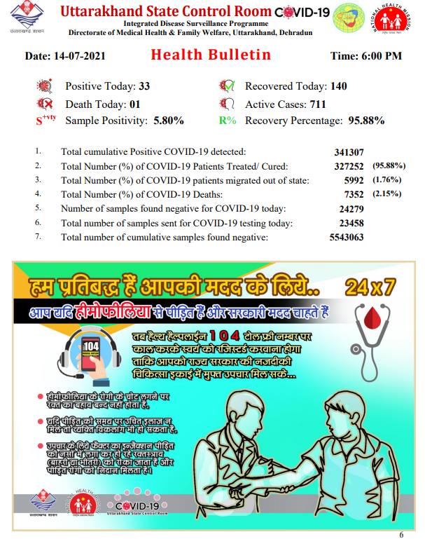 उत्तराखंड स्वास्थ्य विभाग ने जारी किया हेल्थ बुलेटिन, उत्तराखंड में आज कोरोना वायरस के 33 पॉजिटिव मरीज पाए गए, देहरादून में 08 नए मरीज आये सामने. पिछले 24 घंटे में 1 व्यक्ति की हुई कोरोना से मौत.