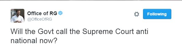 उन्होंने सरकार से सवाल पूछते हुए ट्विटर पर लिखा, ‘‘क्या अब सरकार सुप्रीम कोर्ट को राष्ट्रविरोधी कहेगी?’’ राहुल ने ट्वीट के साथ एक खबर भी टैग की जिसके अनुसार कलकत्ता हाई कोर्ट ने सरकार से कहा है कि उसने कदम उठाने से पहले पूर्व तैयारी नहीं की जबकि सुप्रीम कोर्ट ने कहा कि इससे आगे संकट की स्थिति पैदा हो सकती है.