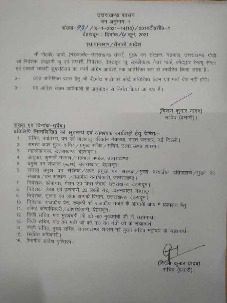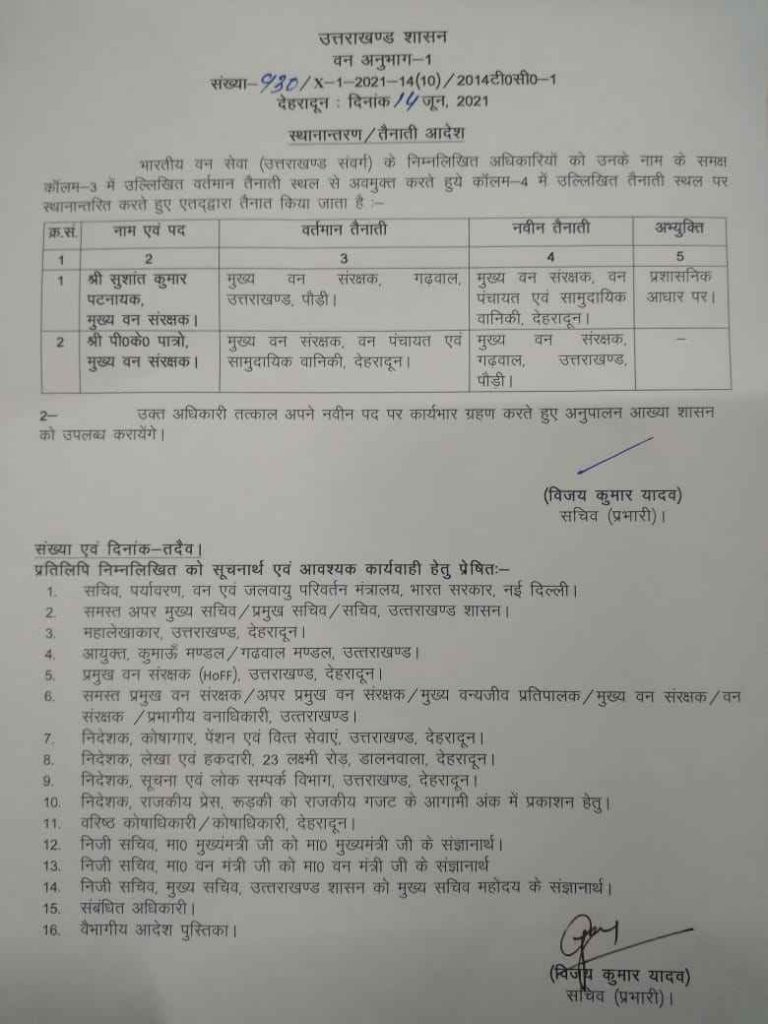 सुशांत कुमार पटनायक मुख्य वन संरक्षक को मुख्य वन संरक्षक वन पंचायत व सामुदायिक वानकी देहरादून बनाया गया इसके अलावा बी के पात्रों मुख्य वन संरक्षक को मुख्य वन संरक्षक गढ़वाल उत्तराखंड पौड़ी की दी गई जिम्मेदारी पी के पात्रों को निदेशक हल्द्वानी जू वह सफारी निदेशक देहरादून जू लच्छीवाला नेचर पार्क कोटद्वार रेस्क्यू सेंटर वह पात्रों सफारी सुपर विजन का कार्य अग्रिम आदेशों तक आवंटित किया जाता है