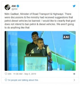 केंद्रीय सड़क एवं राजमार्ग मंत्री नितिन गडकरी ने गुरुवार को कहा कि सरकार का पेट्रोल-डीजल के वाहनों पर प्रतिबंध लगाने का कोई इरादा नहीं है। उन्होंने कहा, ‘इस तरह की बातचीत उठी है और सरकार को सुझाव मिले हैं कि पेट्रोल-डीजल वाहनों पर प्रतिबंध लगा देना चाहिए। मैं इस बात को स्पष्ट कर देना चाहता हूं कि सरकार का पेट्रोल-डीजल वाहनों पर प्रतिबंध लगाने का कोई इरादा नहीं है। हम ऐसा कुछ भी नहीं करने वाले हैं।’