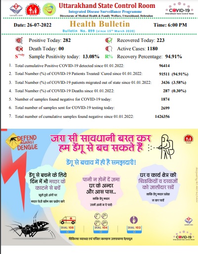 जिसमें अल्मोड़ा में 18, बागेश्वर में 1, देहरादून में 137, हरिद्वार में 22, नैनीताल में 35, पौड़ी गढ़वाल में 3, रुद्रप्रयाग में 2, टिहरी गढ़वाल में 19, उधम सिंह नगर में 32 और उत्तरकाशी में 13 नए मामले मिले है।