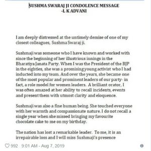 अपने बयान में आडवाणी ने लिखा है कि सुषमा स्वराज के निधन की खबर से वह स्तब्ध हैं। वह एक ऐसी नेता थीं, जिनके साथ भारतीय जनता पार्टी की शुरुआत से ही काम किया। जब अस्सी के दशक में मैं पार्टी का अध्यक्ष था तब सुषमा स्वराज एक युवा नेता के तौर पर उभर रही थीं और मैंने उन्हें अपनी टीम में शामिल किया था। आडवाणी ने आगे लिखा है, समय के साथ-साथ वो पार्टी में मुख्य नेता बनीं और देश की महिलाओं के लिए रोल मॉडल बनीं। वह एक प्रखर वक्ता थीं, जो किसी भी बात को बेहतरीन तरीके से बताने की क्षमता रखती थीं। आडवाणी ने कहा है कि वह एक शानदार इंसान थीं। उन्होंने हर किसी का दिल जीता, हर साल वो मेरे जन्मदिवस के अवसर पर मेरा पसंदीदा चॉकलेट केक लाना नहीं भूलती थीं। उनका जाना देश और निजी तौर पर मेरे लिए एक बड़ी क्षति है। राष्ट्र ने एक असाधारण नेता खो दिया है। मेरे लिए, यह एक अपूरणीय क्षति है और मुझे सुषमाजी की उपस्थिति बहुत याद आएगी।