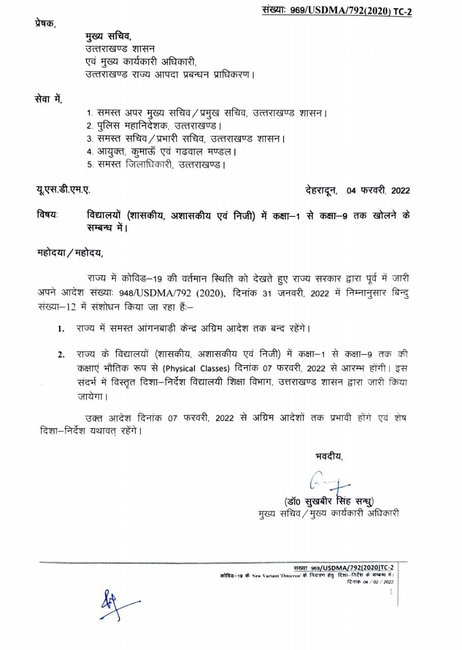 देहरादून- राज्य में लगातार बढ़ रहे कोरोना संक्रमण के चलते सभी स्कूलों को बंद किया गया था…लेकिन अब शासन की ओर से बंद चल रहे कक्षा एक से नौवीं तक के सभी सरकारी, अशासकीय और निजी स्कूलों को 7 फरवरी से खोलने का आदेश जारी कर दिया गया है…