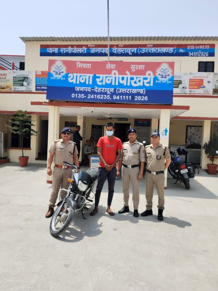 देहरादून : थाना रानीपोखरी पुलिस ने मोटरसाइकिल चोरी के एक मामले का सफल अनावरण करते हुए एक शातिर चोर को गिरफ्तार किया है। आरोपी के कब्जे से चोरी की गई मोटरसाइकिल भी बरामद कर ली गई है।