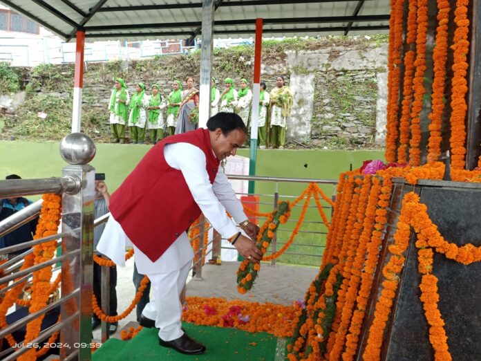 पौड़ी – जिले में कारगिल विजय दिवस को शौर्य दिवस में रूप मनाया गया। कारगिल विजय दिवस की 25वीं वर्षगांठ पर जनपद मुख्यालय के शहीद स्मारक एजेंसी चौक पौड़ी में कैबिनेट मंत्री डॉ. धन सिंह रावत, जिला पंचायत अध्यक्ष शांति देवी, स्थानीय विधायक राजकुमार पोरी, जिलाधिकारी गढ़वाल डॉ. आशीष चौहान सहित अन्य अधिकारियो व पूर्व सैनिकों ने कारगिल युद्ध के शहीद वीर जवानों को पुष्प चक्र व श्रद्धासुमन अर्पित कर श्रद्धांजलि दी गयी। कार्यक्रम से पूर्व छात्र-छात्राओं द्वारा एजेंसी चौक से कलेक्ट्रेट तक प्रभातफैरी निकाली गई।