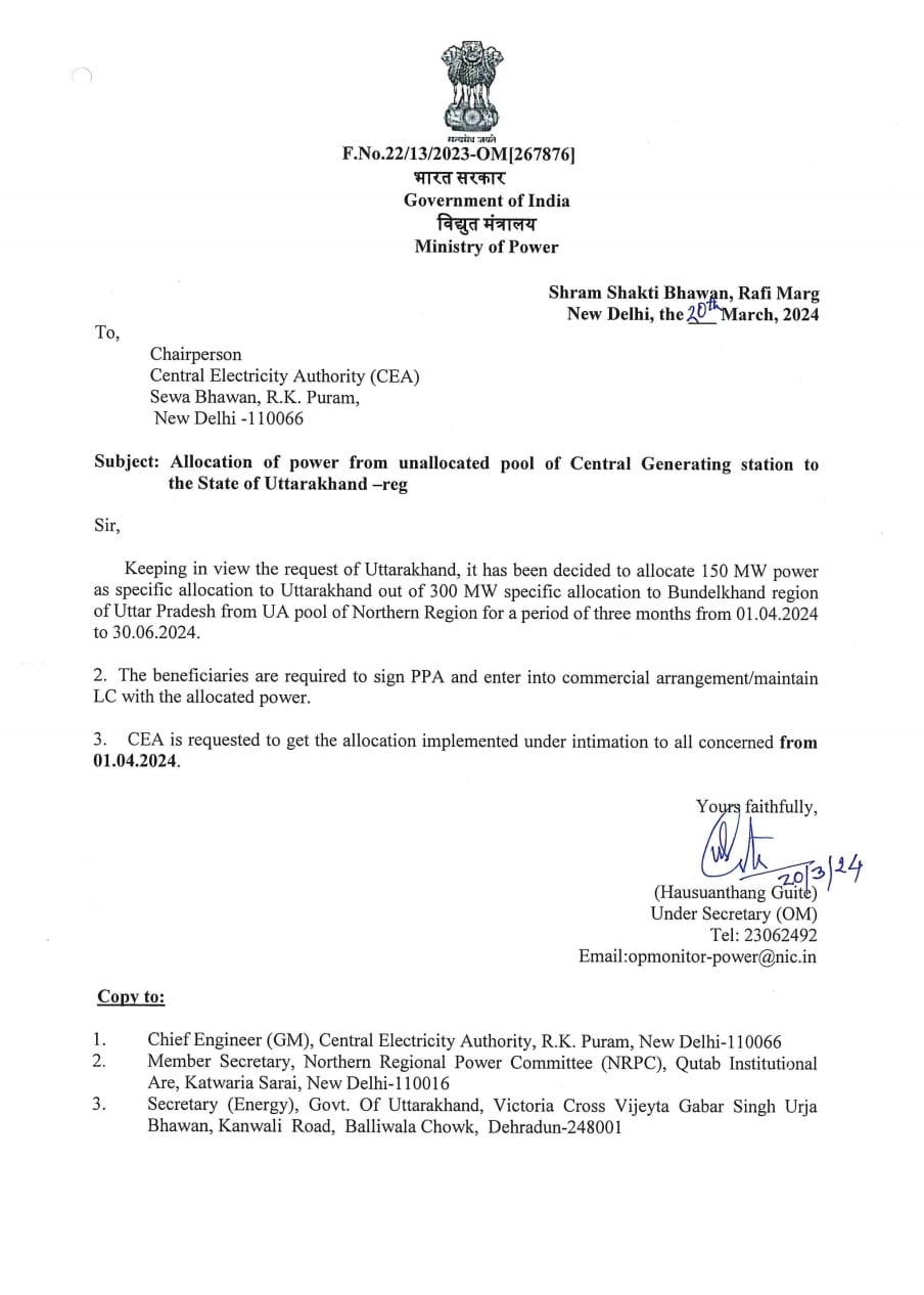 देहरादून – केंद्र सरकार ने उत्तराखंड राज्य के लिए बिजली का अतिरिक्त कोटा आवंटित किया है। यह विशिष्ट आवंटन 1 अप्रैल 2024 से 30 जून 2024 तक के लिए आवंटित किया गया है।