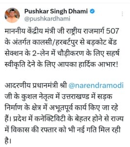 सीएम धामी ने जताया पीएम मोदी व परिवहन मंत्री गडकरी का आभार।