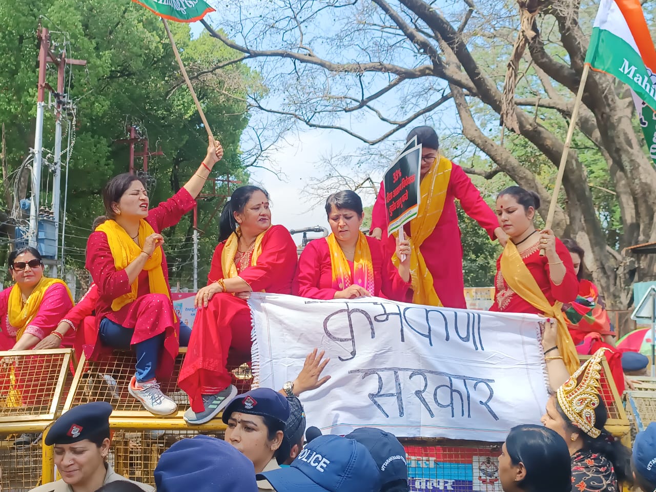 इस दौरान कुछ महिला कार्यकर्ताओं ने बैरिकेडिंग पर चढ़कर विरोध प्रदर्शन किया, जबकि कई अन्य ने सड़क पर बैठकर धरना दिया। इस प्रदर्शन में देहरादून महानगर महिला मोर्चा की अध्यक्ष और पूर्व पार्षद उर्मिला थापा कुंभकर्ण की वेशभूषा में नजर आईं। उनका कहना था कि सरकार कुंभकर्णी नींद में सोई हुई है, और उनकी इस वेशभूषा के माध्यम से वे सरकार को जगाने की कोशिश कर रही थीं।