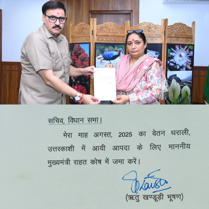 देहरादून: धराली, उत्तरकाशी में हाल ही में आई भीषण आपदा ने अनेक परिवारों को असहनीय दुःख और भारी क्षति पहुँचाई है। इस त्रासदी की घड़ी में उत्तराखंड विधानसभा अध्यक्ष श्रीमती ऋतु खण्डूडी भूषण ने मानवीय संवेदनाओं और कर्तव्यबोध का परिचय देते हुए अपना एक माह का वेतन माननीय मुख्यमंत्री राहत कोष में देने का पत्र विधानसभा सचिव को सौंपा।