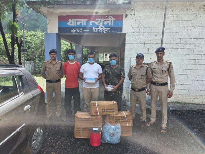 जानकारी के मुताबिक, एसएसपी देहरादून के निर्देश पर जिलेभर में सघन चेकिंग अभियान चलाया जा रहा है ताकि पंचायत चुनाव को निष्पक्ष और शांतिपूर्ण तरीके से सम्पन्न कराया जा सके। इसी क्रम में 10 जुलाई 2025 को त्यूणी पुलिस ने HP नंबर की एक ऑल्टो कार को रोका। तलाशी लेने पर कार से 5 पेटियों में रखा 125 किलो डायनामाइट, 2 डब्बे डेटोनेटर, एक लाल रंग की तार का रोल और नीली रंग की बत्ती का बंडल बरामद हुआ।