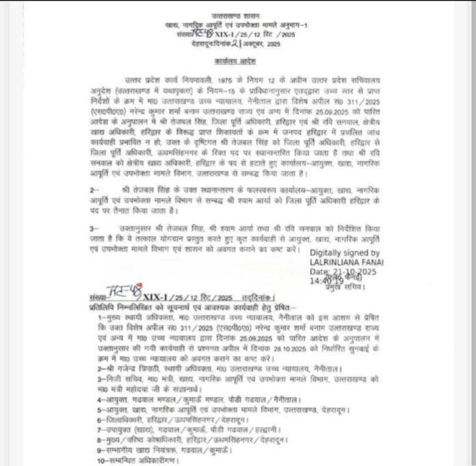 हरिद्वार जिले में राशन डीलरों के आरोपों और हाईकोर्ट के निर्देशों के बाद शासन ने किया प्रशासनिक फेरबदल, क्षेत्रीय अधिकारी रवि सनवार को मुख्यालय से अटैच किया गया।