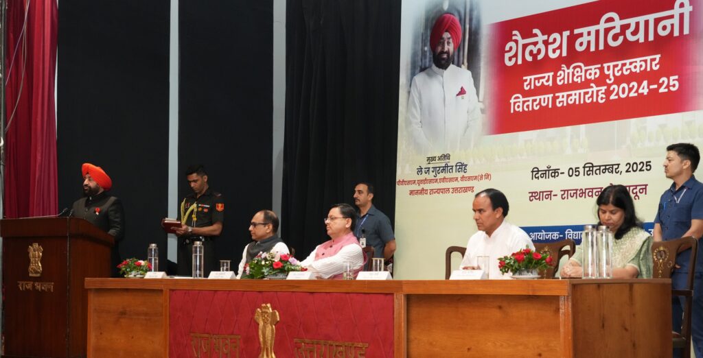 देहरादून: शिक्षक दिवस के अवसर पर शुक्रवार को राजभवन में ‘‘शैलेश मटियानी राज्य शैक्षिक पुरस्कार’’ सम्मान समारोह आयोजित हुआ। समारोह में राज्यपाल लेफ्टिनेंट जनरल गुरमीत सिंह (से नि), मुख्यमंत्री पुष्कर सिंह धामी और शिक्षा मंत्री डॉ. धन सिंह रावत ने वर्ष-2024 में शैलेश मटियानी राज्य शैक्षिक पुरस्कारों के लिए चयनित 16 शिक्षक एवं शिक्षिकाओं को सम्मानित किया। वर्ष-2024 में चयनित 09 प्रारम्भिक शिक्षक, 05 माध्यमिक शिक्षक, 01 शिक्षक प्रशिक्षक एवं 01 संस्कृत शिक्षक को यह सम्मान प्रदान किया गया है। (सूची संलग्न)