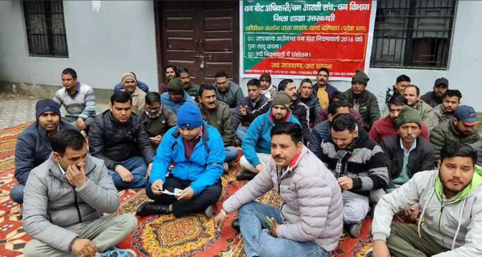 उत्तरकाशी – उत्तरकाशी वन विभाग परिसर के कोट बंगला में वनकर्मियों ने अपनी दो सूत्रीय मांगों को लेकर अनिश्चितकालीन हड़ताल शुरू कर दी है। वनकर्मियों का कहना है कि उनकी पहली मांग यह है कि उत्तराखंड अधीनस्थ वन सेवा नियमावली 2016 को पुनः लागू किया जाए। दूसरी मांग है कि वर्दी नियमावली में संशोधन किया जाए।