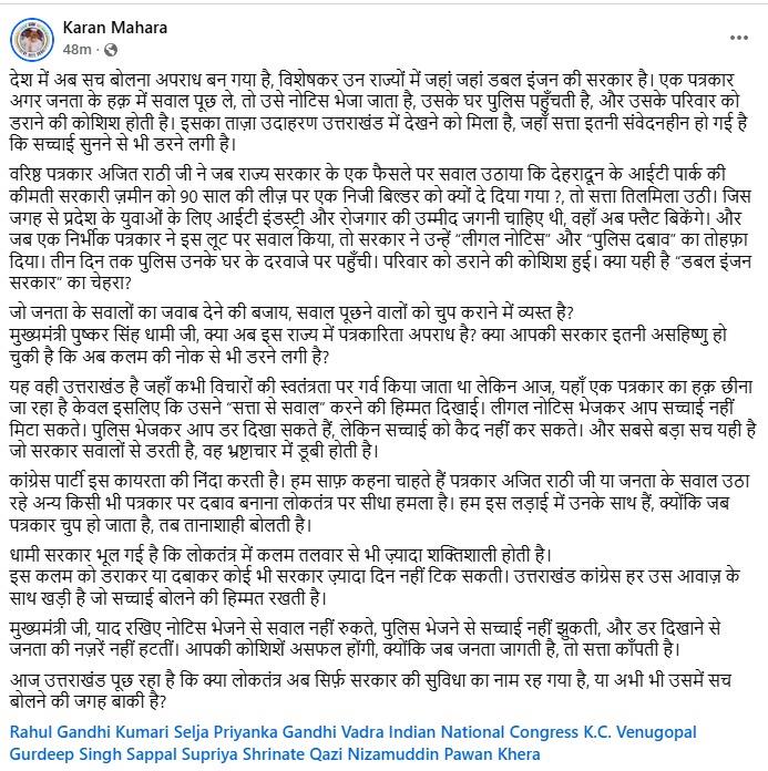 उत्तराखंड के वरिष्ठ पत्रकार अजीत राठी को हाल ही में कानूनी नोटिस भेजे जाने को लेकर उत्तराखंड में चर्चाओं के बाजार गर्म हैं। पत्रकारों और सामाजिक कार्यकर्ताओं के साथ ही अब कांग्रेस प्रदेश अध्यक्ष करन माहरा भई उनके समर्थन में उतर आए हैं। उनका कहना है कि देश में सच बोलना अब अपराध बन गया है।