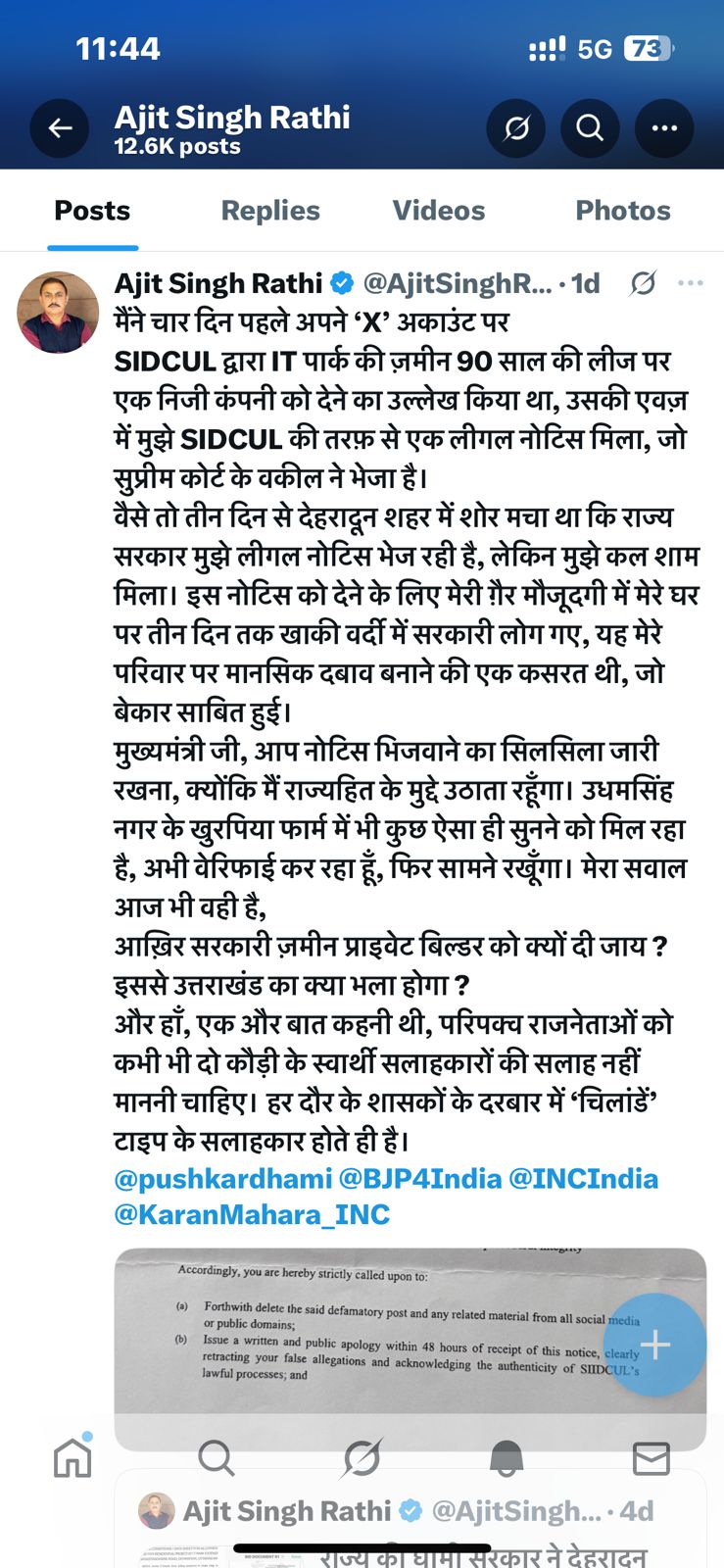 प्रदेश के वरिष्ठ पत्रकार अजीत राठी को लीगल नोटिस भेजने को लेकर अब पत्रकार उनके समर्थन में उतर आए हैं। बता दें कि अजीत राठी ने सोशल मीडिया पर लिखी अपनी एक पोस्ट में राज्य के आईटी पार्क क्षेत्र की जमीन को लेकर सरकार और सिडकुल के बीच हुए एक कथित भूमि आवंटन को लेकर सवाल उठाए थे।