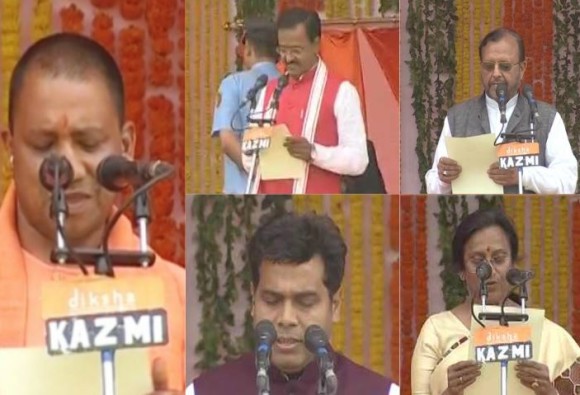 नई दिल्ली: योगी आदित्यनाथ ने आज उत्तर प्रदेश के 21वें मुख्यमंत्री के तौर पर शपथ ले ली है. उनके साथ केशव मौर्य और दिनेश शर्मा ने उपमुख्यमंत्री पद की शपथ ली.इस दौरान मंच पर प्रधानमंत्री नरेंद्र मोदी औऱ बीजेपी के राष्ट्रीय अध्य़क्ष अमित शाह मौजूद हैं. शपथग्रहण लखनऊ स्थित कांशीराम स्मृति उपवन में हो रहा है.
