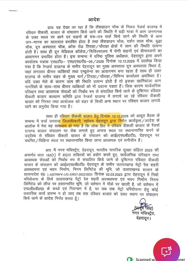 जिला प्रशासन द्वारा भारतीय नागरिक सुरक्षा संहिता, 2023 की धारा 163(1) में प्रदत्त शक्तियों का प्रयोग करते हुए सार्वजनिक परिवहन तथा आवश्यक सेवाओं के निर्बाध संचालन के उद्देश्य से यह आदेश निर्गत किया गया है कि रविवार साप्ताहिक बाजार का संचालन आई०एस०बी०टी०, देहरादून के समीप उत्तराखण्ड मेट्रो रेल शहरी अवस्थापना एवं भवन निर्माण निगम लिमिटेड की उस भूमि पर किया जाएगा, जो उत्तराखण्ड शासन के शासनादेश 02.03.2023 के अंतर्गत देहरादून में नियो (मेट्रो) परियोजना हेतु लीज पर हस्तान्तरित की गई है, तथा वर्तमान में खाली है और एम०डी०डी०ए० के कब्जे एवं नियंत्रण में है। निर्देशित किया गया है कि यह व्यवस्था तब तक प्रभावी रहेगी, जब तक उक्त भूमि पर मेट्रो परियोजना से संबंधित कोई वास्तविक कार्य प्रारम्भ नहीं हो जाता।