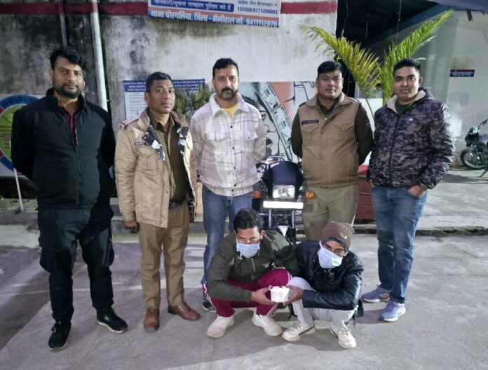 प्रकाश चंद्र एसपी सिटी हल्द्वानी के निर्देशन में, नितिन लोहनी क्षेत्राधिकारी हल्द्वानी और दीपशिखा अग्रवाल क्षेत्राधिकारी लालकुआ के पर्यवक्षण में एसओजी प्रभारी संजीत राठोड और थानाध्यक्ष चोरगलिया के नेतृत्व में पुलिस टीम ने चैकिंग के दौरान एमवीआर गेट से चोरगलिया की ओर जाते समय दो युवकों के कब्जे से भारी मात्रा में अवैध स्मैक बरामद की।