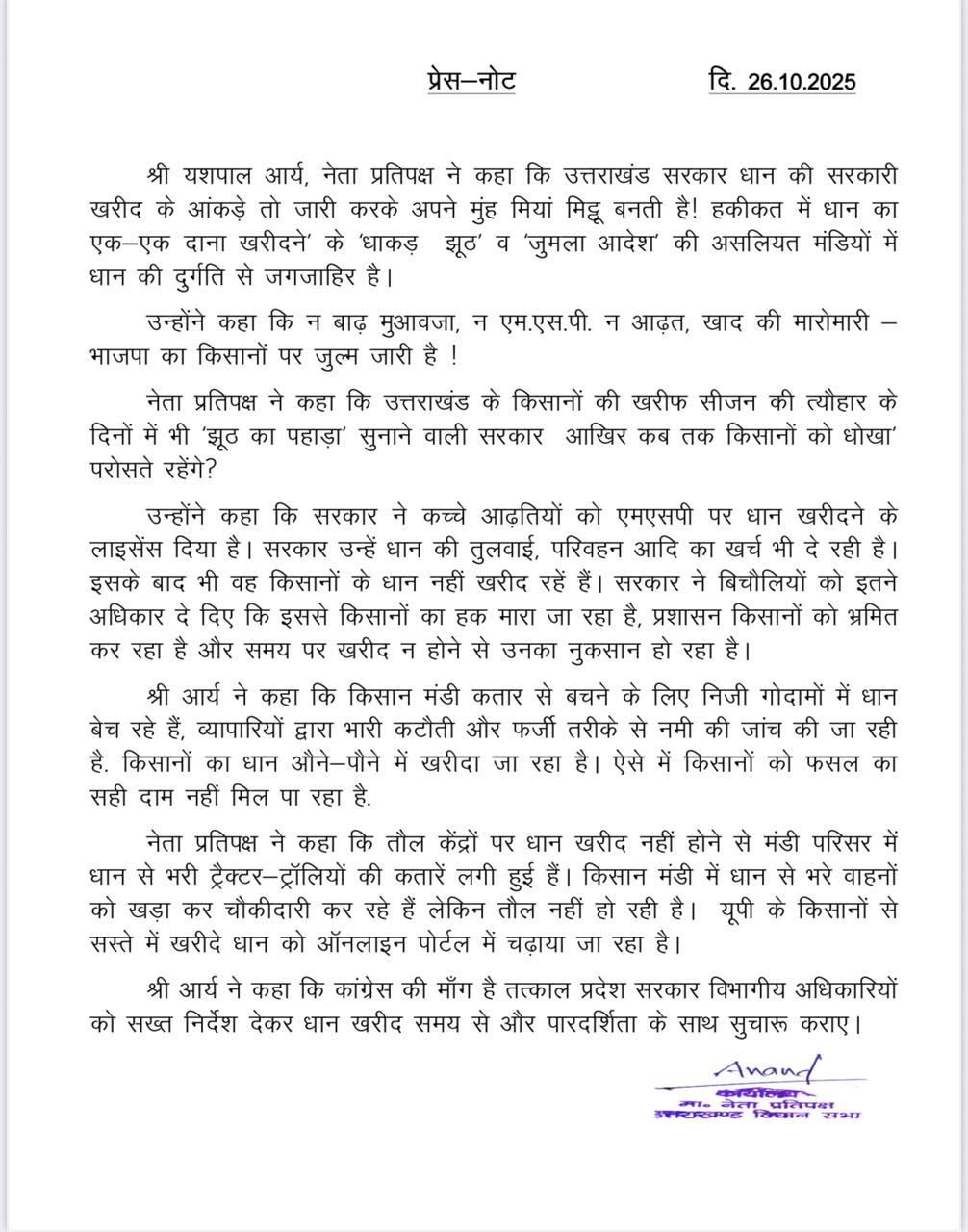 यशपाल आर्य ने प्रदेश सरकार से मांग की है कि विभागीय अधिकारियों को सख्त निर्देश दिए जाएं और धान की खरीदी समय से, पारदर्शिता के साथ सुचारू रूप से सुनिश्चित की जाए।