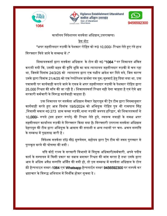 यह कार्रवाई उस शिकायत के आधार पर की गई, जो टोल फ्री नंबर 1064 पर दर्ज कराई गई थी। शिकायतकर्ता ने अवगत कराया कि उसकी बहन की कृषि भूमि से संबंधित वाद न्यायालय तहसीलदार, रुड़की में लंबित है। 21 अप्रैल को उसने पुनः सुनवाई के लिए एक रेस्टोरेशन प्रार्थना पत्र प्रस्तुत किया था, जिसके निस्तारण के एवज में अपर तहसीलदार रुड़की के पेशकार रोहित निवासी मकान संख्या 273, ग्राम कस्बा रुड़की, हरिद्वार