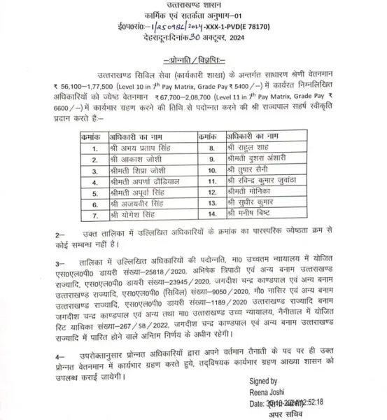 देहरादून – उत्तराखंड में 2017 बैच के PCS अधिकारियों को प्रमोशन का बड़ा तोहफा मिला है। बुधवार देर शाम, कार्मिक विभाग ने 14 PCS अधिकारियों को प्रमोशन देने का आदेश जारी किया है। दीपावली से पहले इन अधिकारियों को प्रमोशन मिलने से खुशी का माहौल है।