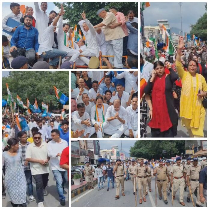 नैनीताल/हल्द्वानी – जिला कांग्रेस के आह्वान पर जिले भर के कांग्रेसियों ने हल्द्वानी में एमबी इंटर कॉलेज के मैदान से जनाक्रोश रैली निकाली, जो नैनीताल रोड होते हुए जिलाधिकारी के कैंप कार्यालय तक पहुंची। लेकिन जिलाधिकारी के कैंप कार्यालय से लगभग 200 मीटर पहले पुलिस ने बैरिकेडिंग कर रैली को रोक लिया था।