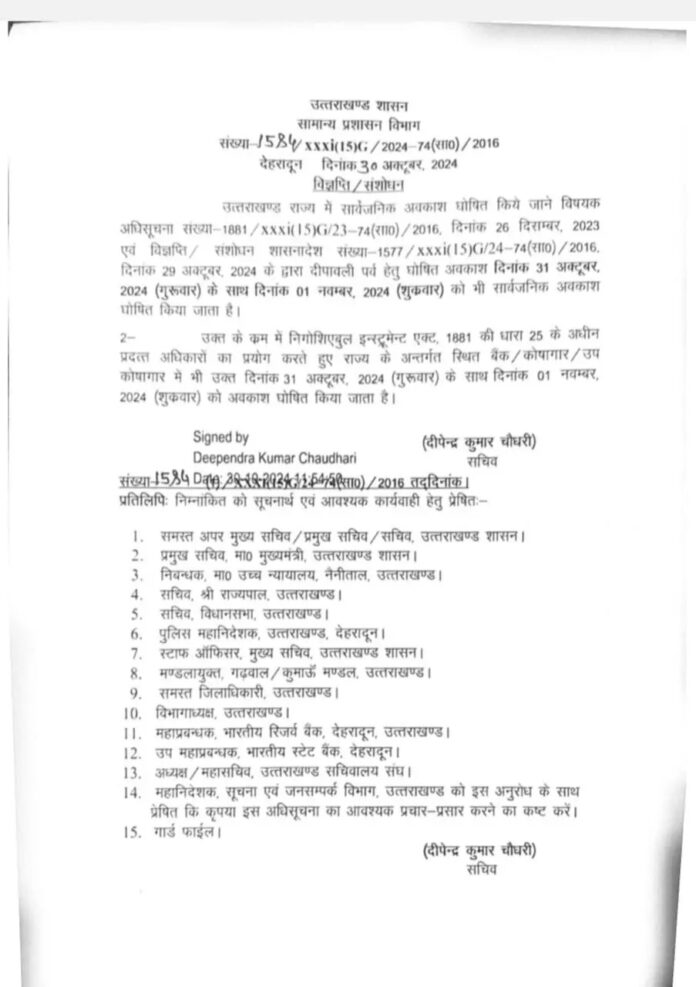 देहरादून – उत्तराखंड सरकार ने 1 नवंबर को दिवाली के अवसर पर सार्वजनिक अवकाश की घोषणा की है। इससे पहले, 31 अक्टूबर को पहले से घोषित छुट्टी के कारण इस विषय पर संशय बना हुआ था। अब, 1 नवंबर को भी छुट्टी की मांग पूरी होने से प्रदेश के लोगों में खुशी का माहौल है।