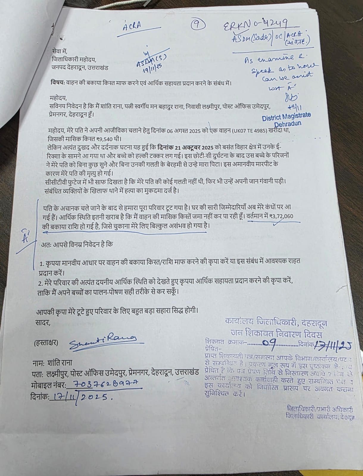 जिलाधिकारी सविन बंसल की अध्यक्षता में विगत नवम्बर माह में आयोजित जनता दर्शन कार्यक्रम में विधवा शांति राणा ने अपनी व्यथा रखते हुए बताया कि उनके पति ने परिवार की आजीविका के लिए ई-रिक्शा क्रय करने हेतु रु. 3,72,600 का ऋण लिया था। दुर्भाग्यवश एक दुर्घटना में उनके पति मनबहादुर की मृत्यु हो गई, जिसके उपरांत परिवार में कमाने वाला कोई नहीं बचा। उनकी 12 वर्षीय बेटी अंशिका, बेटा 05 अक्षय व एक अन्य बेटा किशोर अवस्था में है जिसकी परवरिश और सीमित संसाधनों के कारण वह ऋण की किश्तें जमा करने में असमर्थ हैं। जिलाधिकारी ने शांति राणा को योग्यता अनुसार संस्थान में सेवायोेजित करने तथा बेटी की अंशिका की शिक्षा का वहन जिला प्रशासन करेगा इसके लिए जिलाधिकारी ने उप जिलाधिकारी को कार्यवाही के निर्देश दिए हैं।