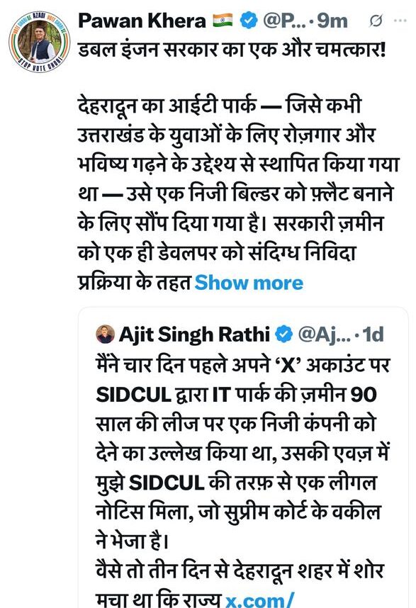 कांग्रेस प्रदेश अध्यक्ष करन माहरा के समर्थन के बाद अब इस मामले की गूंज दिल्ली तक पहुंच गई है। कांग्रेस के वरिष्ठ नेता पवन खेड़ा ने इसे लेकर सोशल मीडिया पर पोस्ट किया है। उनके पोस्ट के बाद से दिल्ली में सत्ता के गलियारों में भी इसकी चर्चा हो रही है। उनके एक पोस्ट से उत्तराखंड से उठी चिंगारी आग बनकर देश भर में फैल रही है।