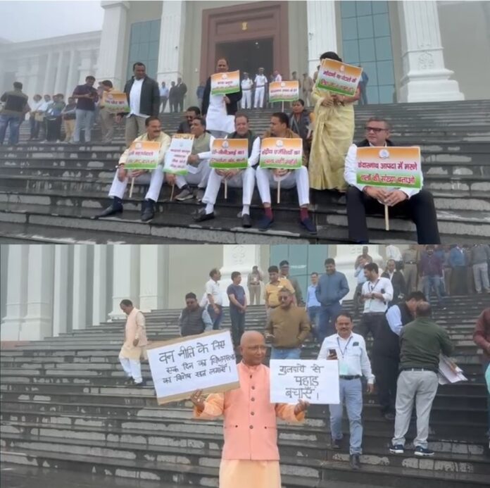 चमोली/भराड़ीसैंण – गैरसैंण में उत्तराखंड विधानसभा सत्र के दूसरे दिन आज विपक्ष ने कानून व्यवस्था समेत अन्य कई मुद्दों को धार देकर सदन के बाहर सरकार को घेरा। केंद्रीय जांच एजेंसियों का दुरुपयोग कर विपक्षी नेताओं के खिलाफ कार्रवाई करने के विरोध में कांग्रेस विधायकों ने विधानसभा के बाहर सीढ़ियों में प्रदर्शन किया। कांग्रेस नेताओं ने पूंजी पत्तियां के खिलाफ और सेबी प्रमुख के खिलाफ भी कार्रवाई करने की मांग की। प्रदर्शन में नेता प्रतिपक्ष यशपाल आर्य, विधायक भवन कापड़ी, विधायक ममता राकेश, विधायक सुमित ह्रदयेश, आदेश चौहान समेत सभी विधायक मौजूद रहे।