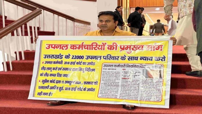 देहरादून – खानपुर से निर्दलीय विधायक उमेश कुमार शुक्रवार को उत्तराखंड के 22,000 उपनल (उत्तराखंड पूर्व सैनिक कल्याण निगम) कर्मचारियों की समस्याओं को लेकर विधानसभा पहुंचे। इस दौरान उन्होंने विधानसभा के प्रवेश द्वार पर एक पोस्टर लेकर प्रदर्शन किया।