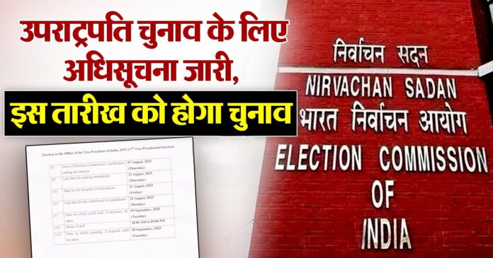 पूर्व उपराष्ट्रपति जगदीप धनखड़ ने 21 जुलाई को अचानक इस्तीफा दे दिया था, जिसके बाद यह पद खाली हो गया। चुनाव आयोग के अनुसार 7 अगस्त को अधिसूचना जारी होगी, 21 अगस्त नामांकन की अंतिम तिथि होगी, 22 अगस्त को नामांकन पत्रों की जांच की जाएगी और 25 अगस्त तक नाम वापसी की अनुमति होगी।